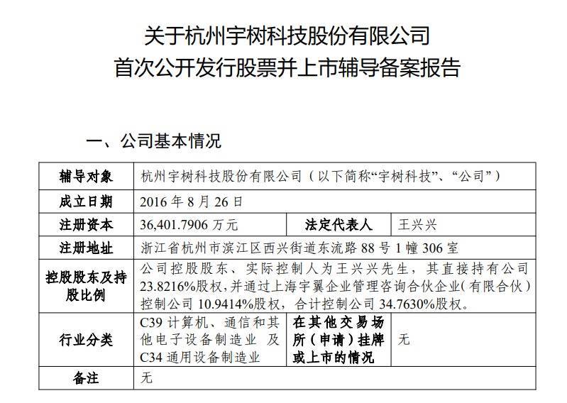辅导备案报告提到,宇树科技控股股东、实际控制人为王兴兴,直接持有公司23.8216%股权,并通过上海宇翼企业管理咨询合伙企业(有限合伙)控制公司10.9414%股权,合计控制公司34.7630%股权。