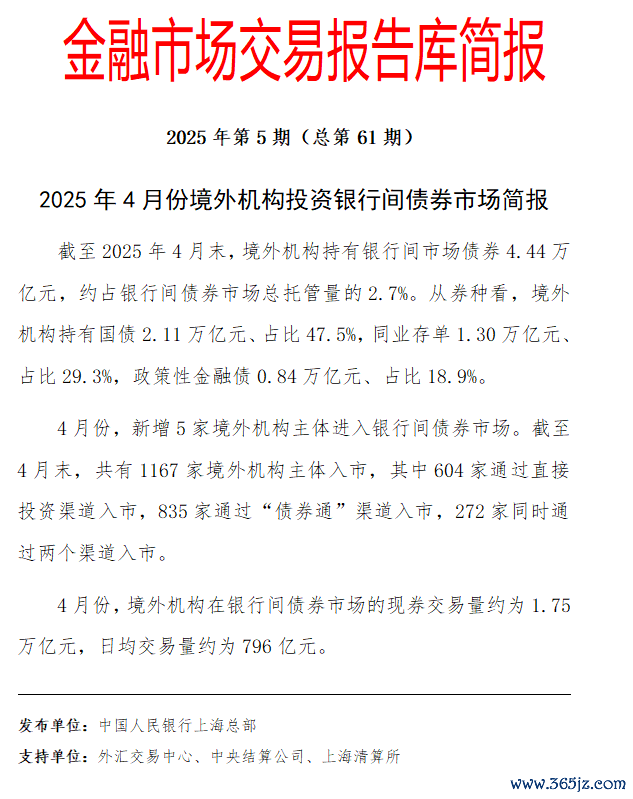4月份,境外机构在银行间债券市场的现券交易量约为1.75万亿元,日均交易量约为796亿元。